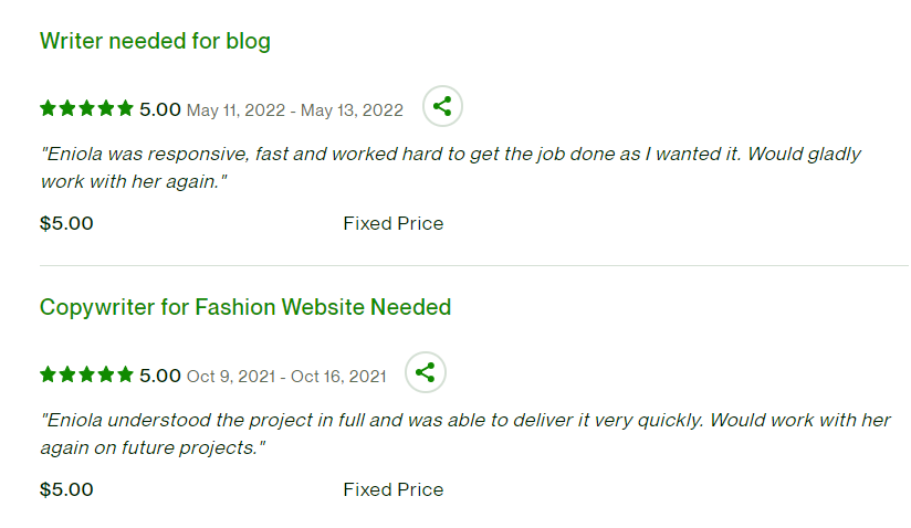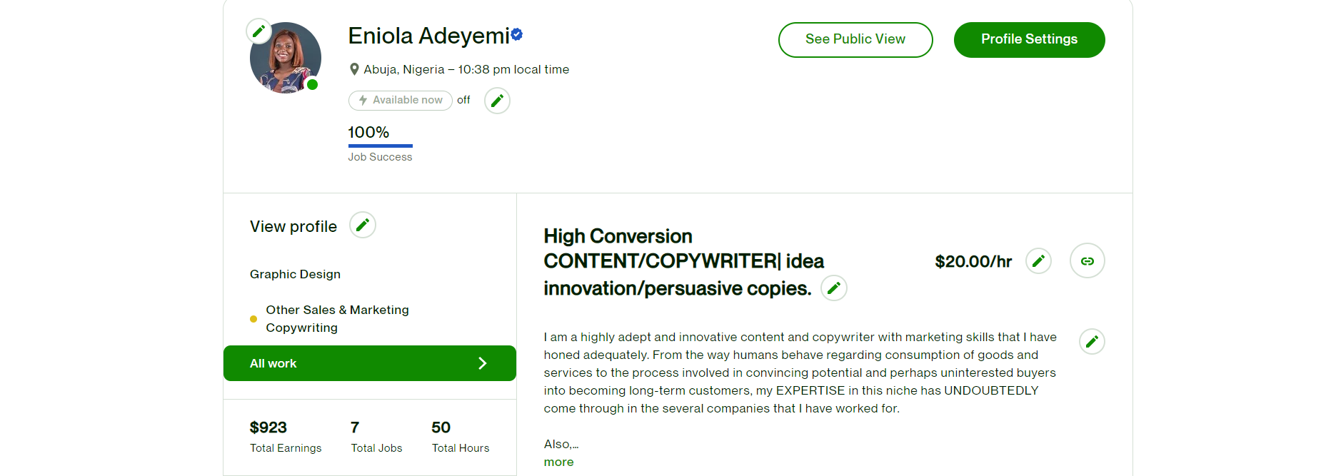 I am a HIGH-CONVERSION freelance content writer ( copywriting, blog writing, and article writing). I freelance on Upwork, among other platforms.